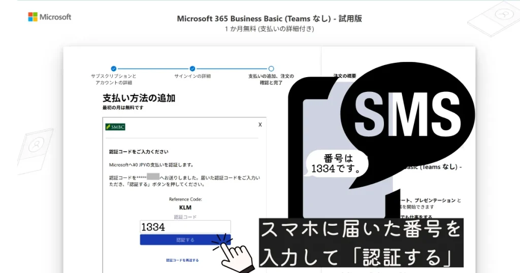 登録の途中で、スマートフォンに届いた番号を入力して本人確認を進める場面があります。