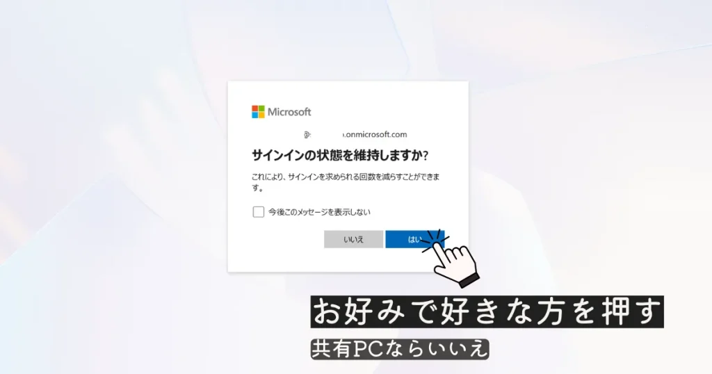 ボタンの位置や表示が多少違っても、近い名前の項目を選べば進めることがよくあります。 - サインイン状態の維持は「はい」と「いいえ」どちらがいいですか?