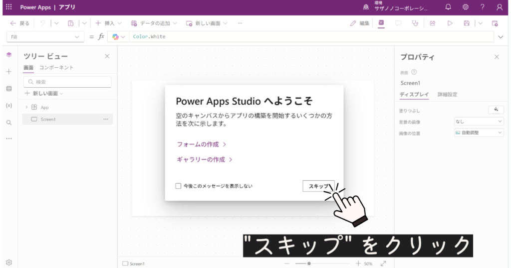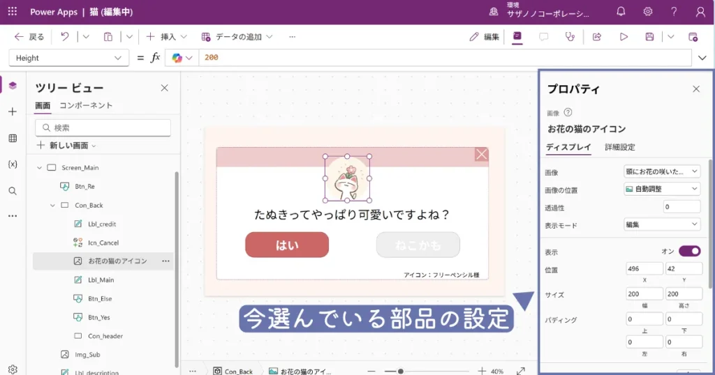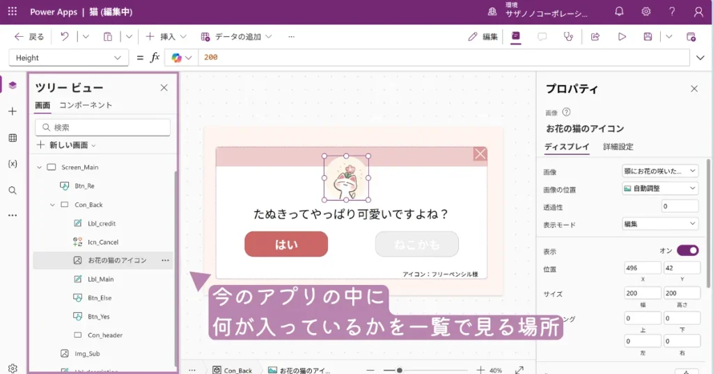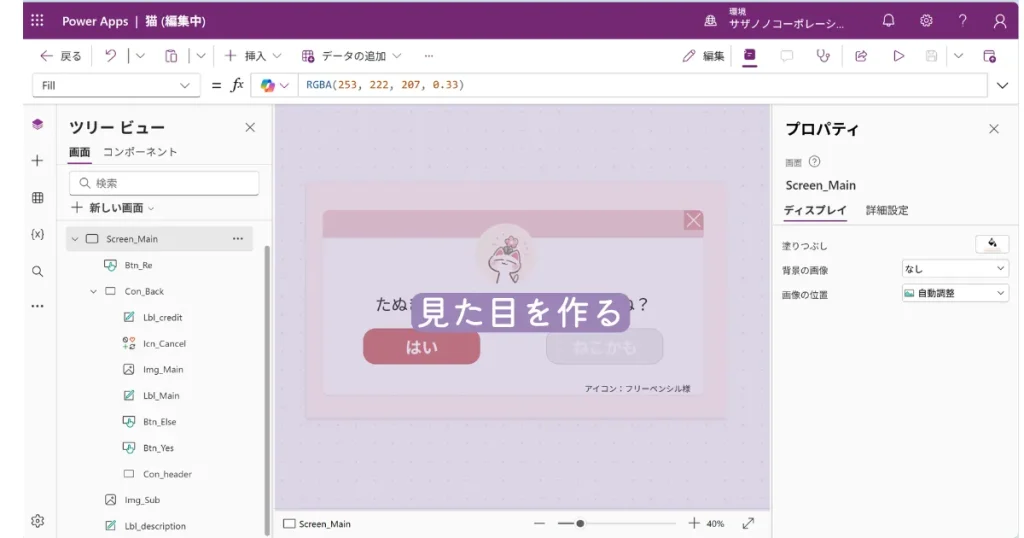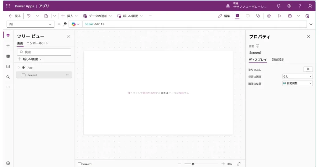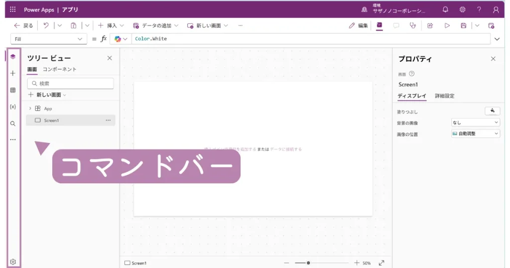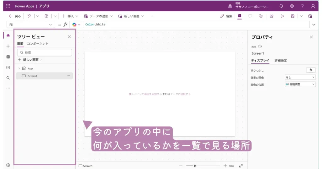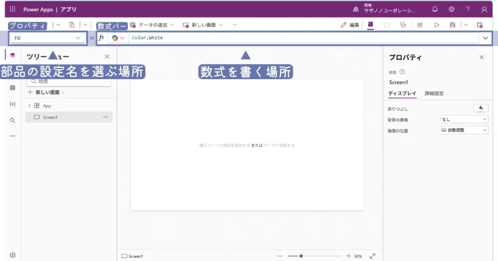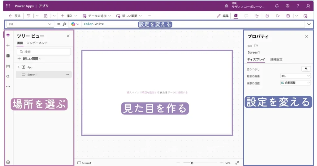 Power Apps Studio では、左側の作成メニュー、中央のキャンバス、上のプロパティリストと数式バー、右側の設定関連エリアを行き来しながら編集していきます。