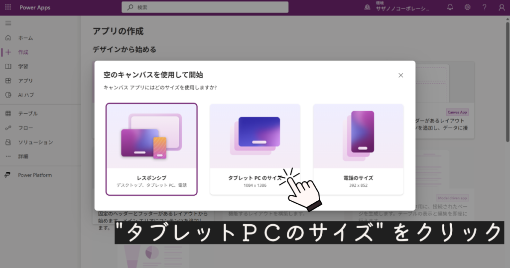空白のキャンバスアプリを作る時は、サインイン後に 「作成」→「空白から開始」 と進むと、アプリのサイズを選んで作成できます。