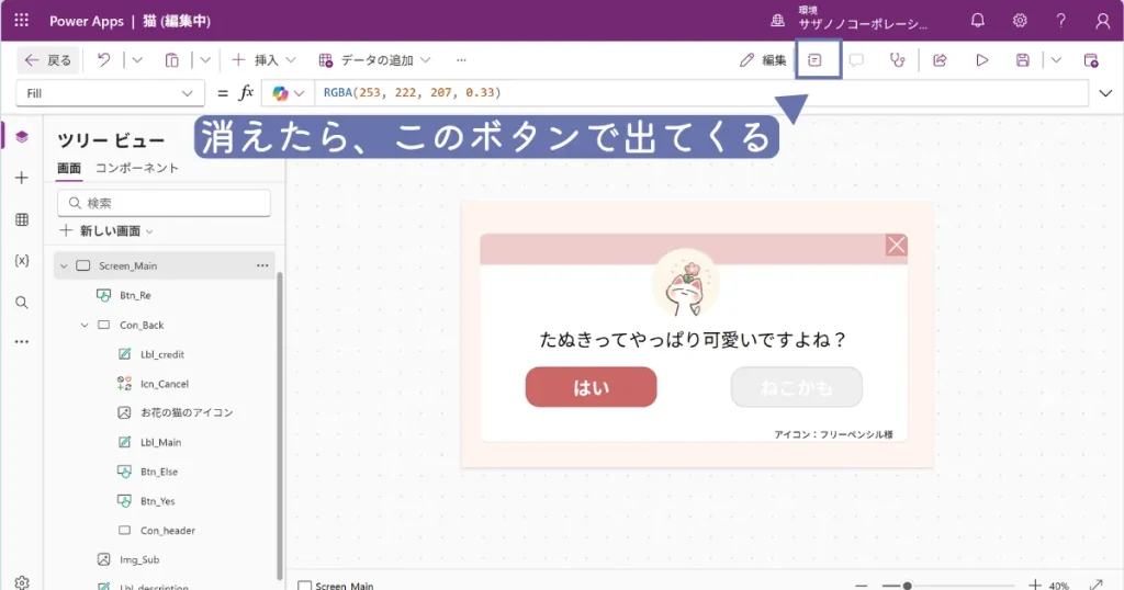 Power Apps Studio は画面構成が更新されることもありますが、右側の設定関連エリアは表示の切り替えで戻せることがあります。まずは右上付近の表示切り替えを確認してみてください。 - 初心者は Power Apps で最初に何を触ればいいですか?