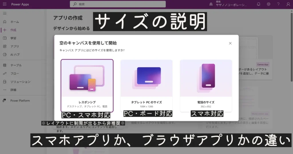 空白のキャンバス アプリを一から作成する – Power Apps | Microsoft Learn - Power Apps で最初に選ぶなら、レスポンシブ・タブレット・電話のどれがいいですか?