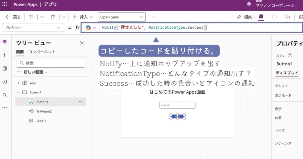 今回の例では、OnSelect にNotify("押せました", NotificationType.Success)