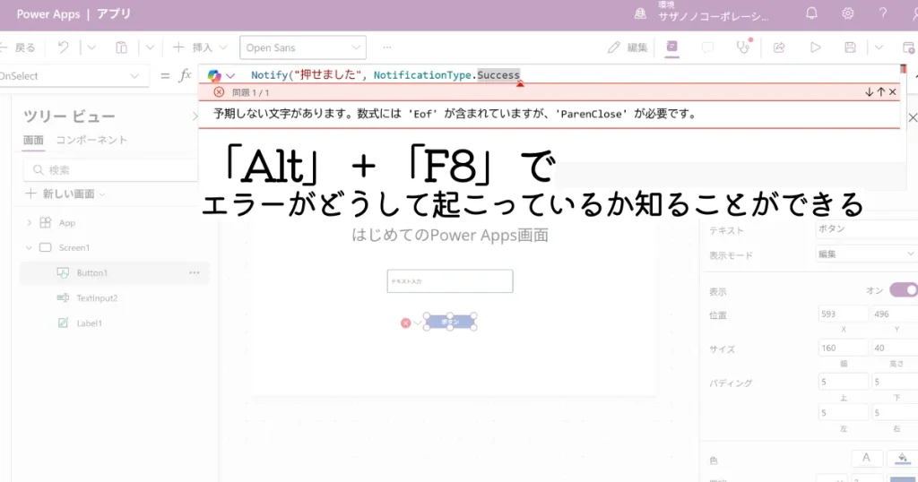よくあるのは、OnSelect に入れた式の入力ミスです。